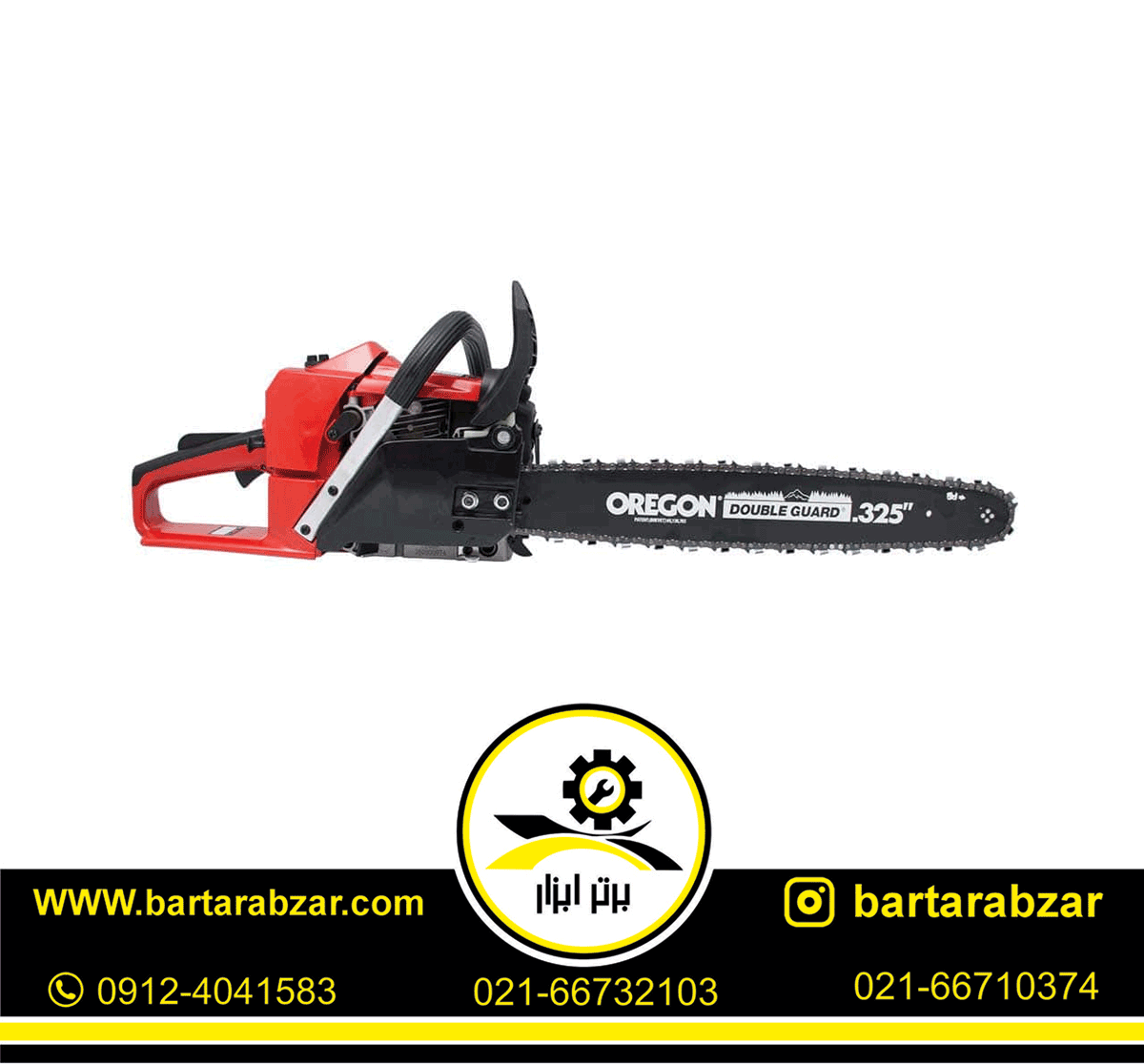تیغه و زنجیر استفاده شده در دستگاه از برند معتبر Oregon آمریکاست. برای تعویض تیغه با بیرون آوردن زنجیر، کافی است پس از قفل کردن زنجیر، مهرههای انتهایی آن را شل کنید و تعویض را به راحتی انجام دهید.